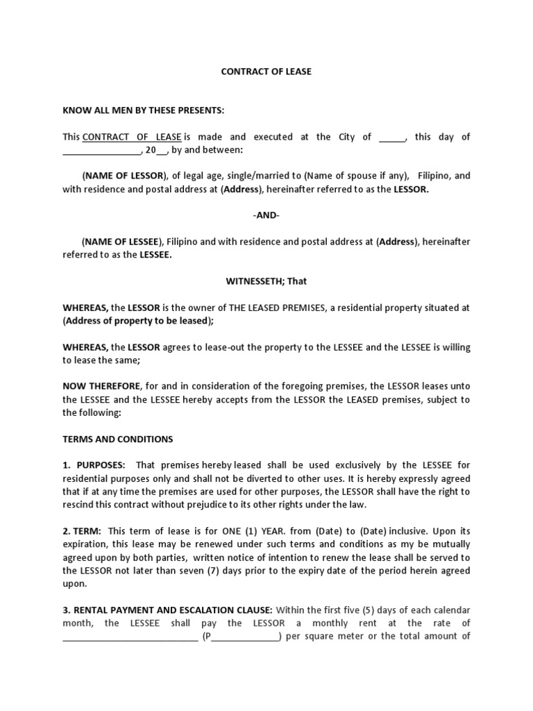 A lease agreement is a contract between a landlord and a tenant that covers the renting of property for long periods of time, usually a period of 12 months it is advantageous to a tenant because it locks in the rental amount and length of lease and cannot be changed even if property or rent values rise. It is very important that arrangements between two parties are formalised and put on paper, and the same goes when however, it is important to remember that a contract containing elements that are not permitted by law, such as increasing the rent by more than. Additionally, a standard rental agreement is. Is that lease is (chiefly dialectal) to gather or lease can be to tell lies; When do i need a rent or lease agreement? The monthly rental rate for the leased premises shall be in pesos: A standard rental contract can be downloaded or can be bought from most stationery shops. Guide to lease vs rent. But each serves a very different purpose. Amount in words (p 00,000.00), philippine currency. The lease contract lays out penalties and consequences, including possible eviction, if the rent isn't paid on time. If the right is not exercised the option. What is the difference between a residential lease and a commercial lease?